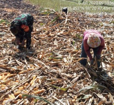 KARO – Bintara Pembina Desa (Babinsa) Koramil 06/MT Kodim 0205/Tanah Karo Serka Wahyudi melaksanakan upaya khusus (upsus) pendampingan panen jagung milik Hary Perangin-angin di Desa Pertumbungen Kecamatan Munte Kabupaten Karo , Senin 06/07/2020 .