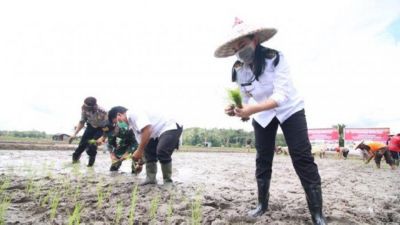 TRIBUNPONTIANAK.CO.ID, LANDAK - Bupati Landak Karolin Margret Natasa melakukan tanam padi di Desa Sebangki, Kecamatan Sebangki, Landak pada Rabu 4 Nopember 2020.