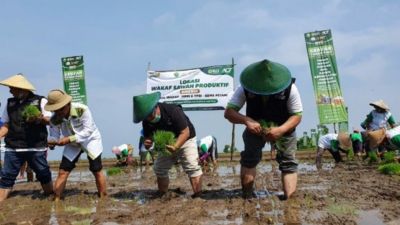 INDUSTRY.co.id-Jatim - Global Wakaf-ACT bersama Yayasan Penguatan Peran Pesantren Indonesia (YP3I) dan Gema Petani, menggelar Gebyar Tanam Padi di Dusun Tumpangsari, Desa Jiyu, Kabupaten Mojokerto, Sabtu (26/12/2020).