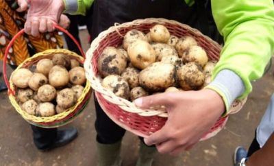 Brul…brul…Ketiga pejabat itu bersamaan menarik batang kentang dari dalam tanah. Umbi-umbi kentang sekepalan tangan tampak bergantungan. Ada semburat warna kuning-khaki dari kulit kentang yang berlumur tanah itu. Umbi kentang yang sehat. “Produktivitasnya di atas 15 ton per hektare,” kata Menteri Yasin Limpo, dengan bersemangat.