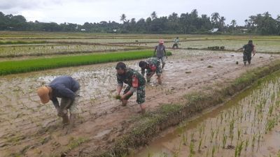 "Kegiatan pendampingan ini kita lakukan bersama personil Babinsa lainnya langsung turun kesawah guna mempercepat masa tanam pada musim ini, meski masih berpakaian loreng kita tetap semangat membantu petani," kata Sertu Faisal.