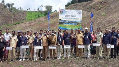 POS-KUPANG.COM, WAIKABUBAK - Pemimpin Bank NTT Cabang Waikabubak, Kabupaten Sumba Barat, Ketut Edy Suyantha bersama Penjabat Sekda Kabupaten Sumba Barat, Drs.Daniel Pabala dan sejumlah pimpinan organisasi perangkat daerah (OPD) lingkup Pemkab Sumba Barat secara resmi melakukan penanaman perdana padi gogo diatas lahan seluas 1 ha dari target 400 ha di Desa Wetanah, Kecamatan Lamboya Barat, Sumba Barat, Senin 20 Desember 2021.