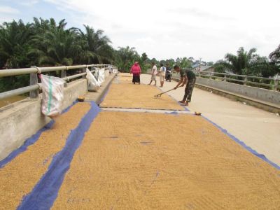 Satgas TMMD Bantu Ibu-Ibu Desa Sungai Terap Jemur Padi