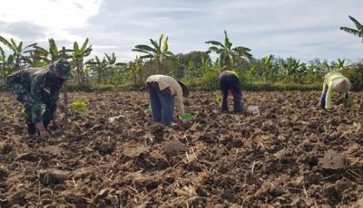 Telihat anggota satgas TNI Manunggal Membangun Desa (TMMD) ke-111 Kodim Pati sedang membantu Sartini (44) warga Dukuh Kemiri RT.02/02 Desa Tamansari Kecamatan Jaken. Serda Sukarji membantu memasukkan bibit jagung ke dalam lubang yang telah dibuat dengan menggunakan alat tradisional dari sebatang kayu, Senin (28/6/2021).