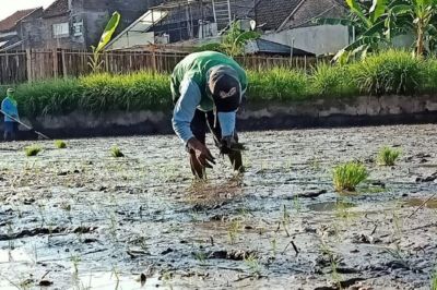 Udara pagi masih dingin, tetapi semangat Ponimin (40) dan dua rekannya untuk bekerja di sawah tidak surut.