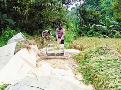 MAJALENGKA, AYOCIREBON.COM -- Seorang anggota Polres Majalengka memiliki cara unik untuk menggugah kesadaran masyarakat menerapkan protokol kesehatan (prokes) pencegahan Covid-19. Brigadir Indra, petugas Bhabinkamtibmas Polsek Jatiwangi, melakukannya seraya memanen padi bersama masyarakat petani, Selasa (12/1/2021). Berbekal arit kecil, dia menyambangi petani yang tengah panen di Desa Padaherang, Kecamatan Sindangwangi, Kabupaten Majalengka. "Sebagai Babinkamtibmas, kami harus selalu siap sedia membantu warga desa, termasuk apalagi saat panen seperti ini," ungkapnya. Selain memanen bersama warga, Indra pula bercengekrama bersama mereka saat mengambil waktu istirahat di sebuah saung di areal persawahan. Kesempatan itu pun dimanfaatkannya untuk kembali mengingatkan masyarakat atas risiko pandemi Covid-19 yang belum usai. "Sekaligus mengimbau masyarakat untuk menerapkan prokes pencegahan Covid-19, seperti mencuci tangan dengan sabun, mengenakan masker saat beekumpul, menjaga jarak, menjauhi kerumunan, hingga membatasi mobilitas," bebernya. Kegiatan semacam itu sendiri, menurutnya, dilakukan sebagaimana anjuran pemerintah sebagai upaya percepatan memutus mata rantai penyebaran virus SARS-CoV-2 penyebab penyakit menular Covid-19, khususnya di Kabupaten Majalengka.